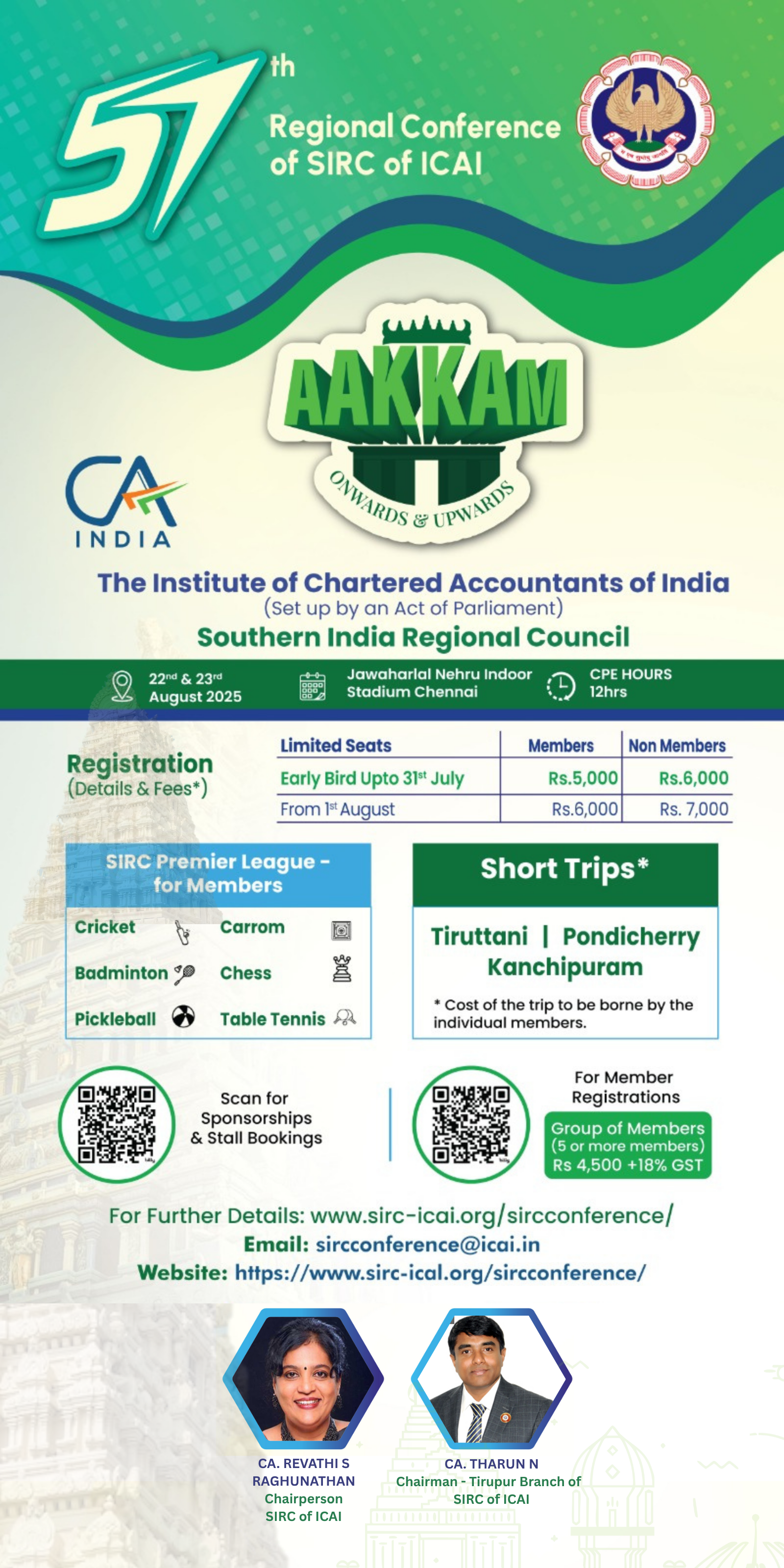 57th Regional Conference of SIRC of ICAI is scheduled to be held on 22nd and 23rd August 2025 at Jawaharlal Nehru Indoor Stadium, Chennai, with the theme “Aakkam—Onwards and Upwards.”