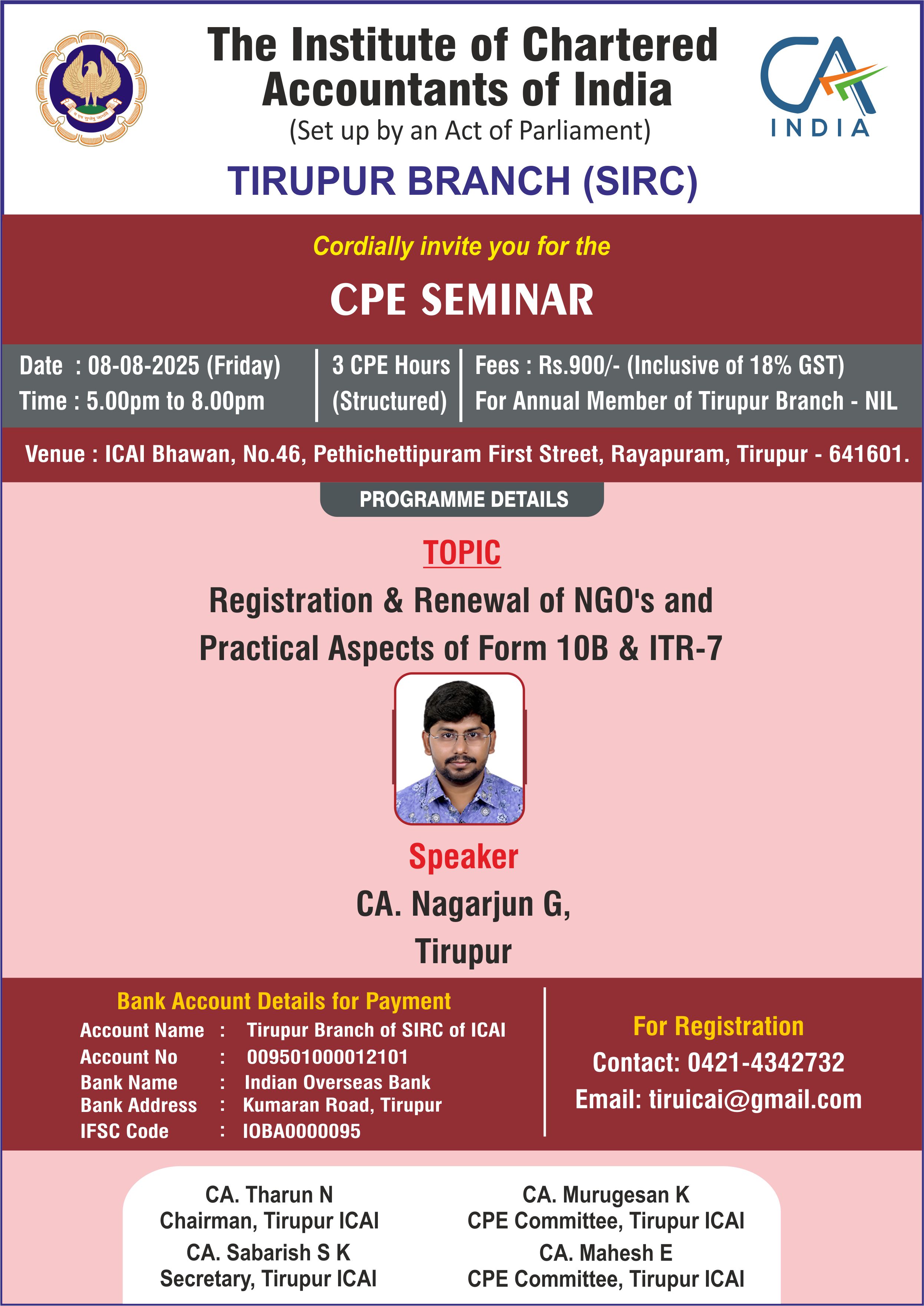 Description CPE SEMINAR ON REGISTRATION & RENEWAL OF NGO'S AND PRACTICAL ASPECTS OF FORM 10B & ITR-7 Date & Time :- 08th August 2025, Friday at 5.00pm Venue :- ICAI Bhawan, Tirupur CPE Credit :- 3 hrs Speaker :- CA. Nagarjun G, Tirupur No Fees For Chain Seminar Registrants Rs.900/- Per Member For Spot Registrants