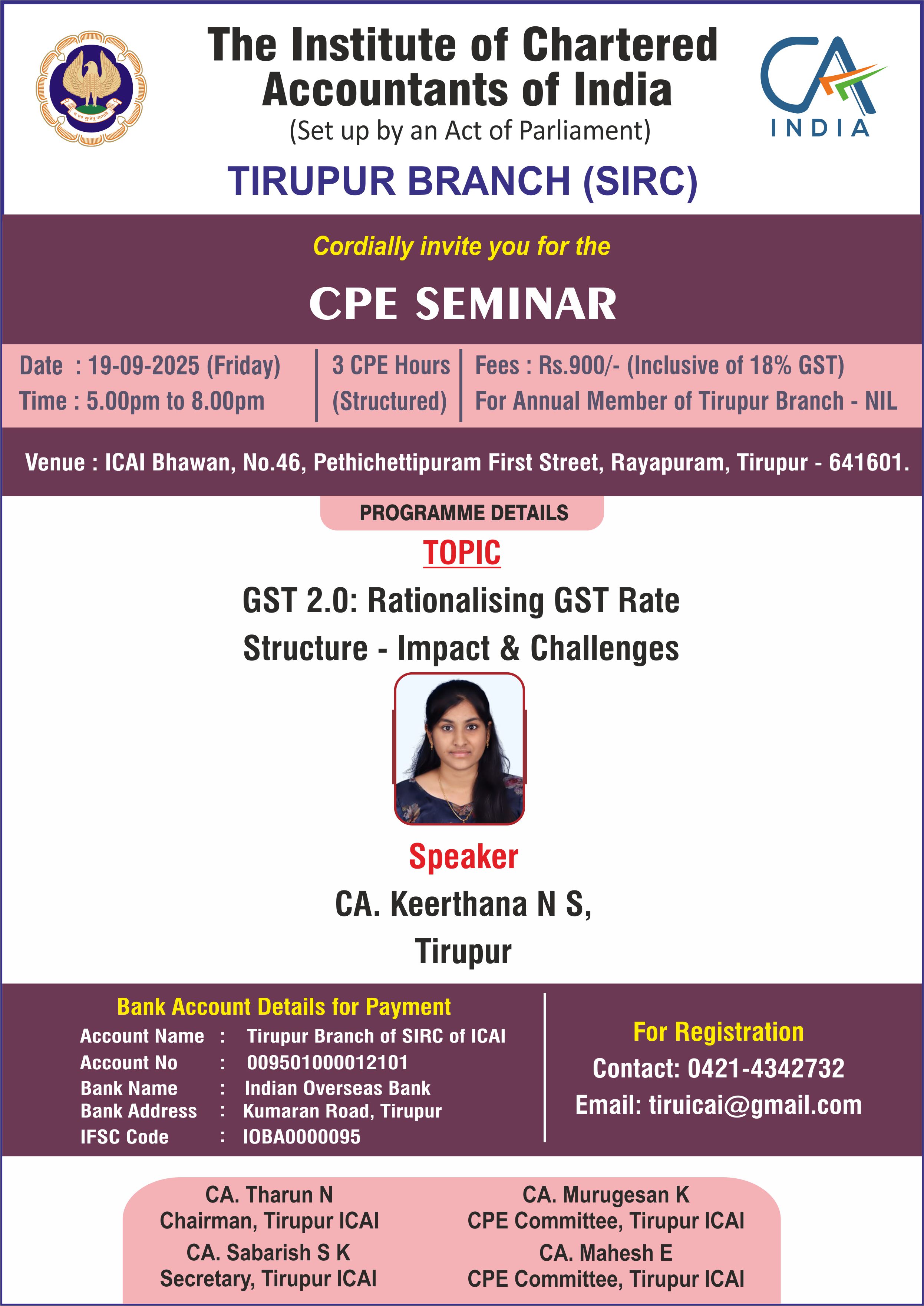 Description CPE SEMINAR ON GST 2.0: RATIONALISING GST RATE STRUCTURE - IMPACT & CHALLENGES Date & Time :- 19th September 2025, Friday at 5.00pm Venue :- ICAI Bhawan, Tirupur CPE Credit :- 3 hrs Speaker :- CA. Keerthana N S, Tirupur No Fees For Chain Seminar Registrants Rs.900/- Per Member For Spot Registrants