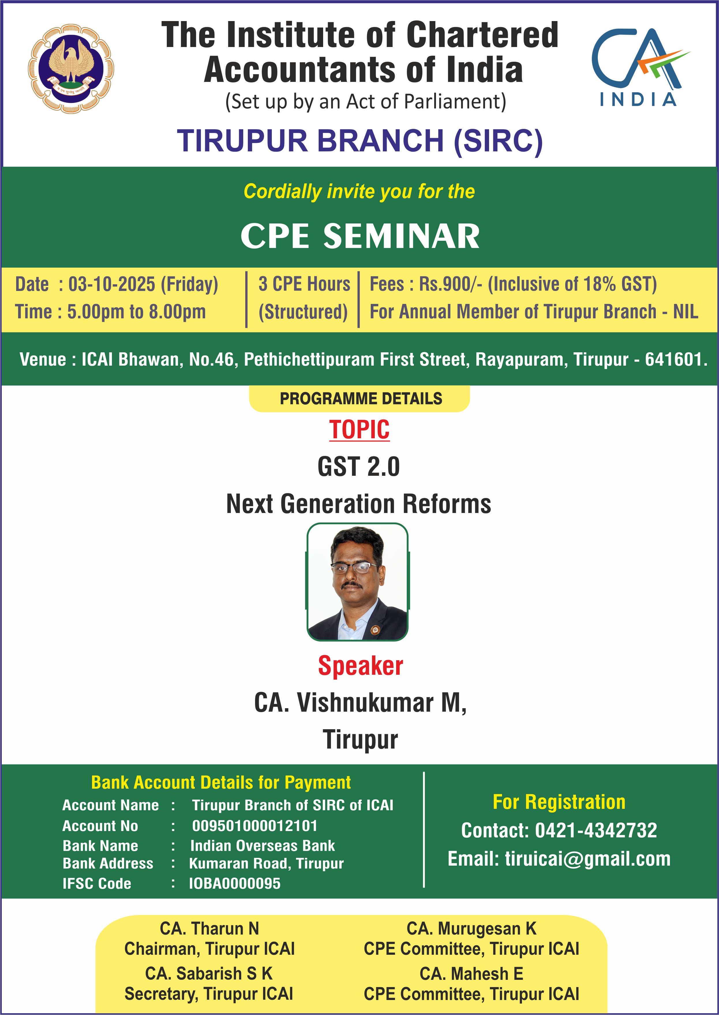 Description CPE SEMINAR ON GST 2.0 NEXT GENERATION REFORMS Date & Time :- 03rd October 2025, Friday at 5.00pm Venue :- ICAI Bhawan, Tirupur CPE Credit :- 3 hrs Speaker :- CA. Vishnukumar M, Tirupur No Fees For Chain Seminar Registrants Rs.900/- Per Member For Spot Registrants